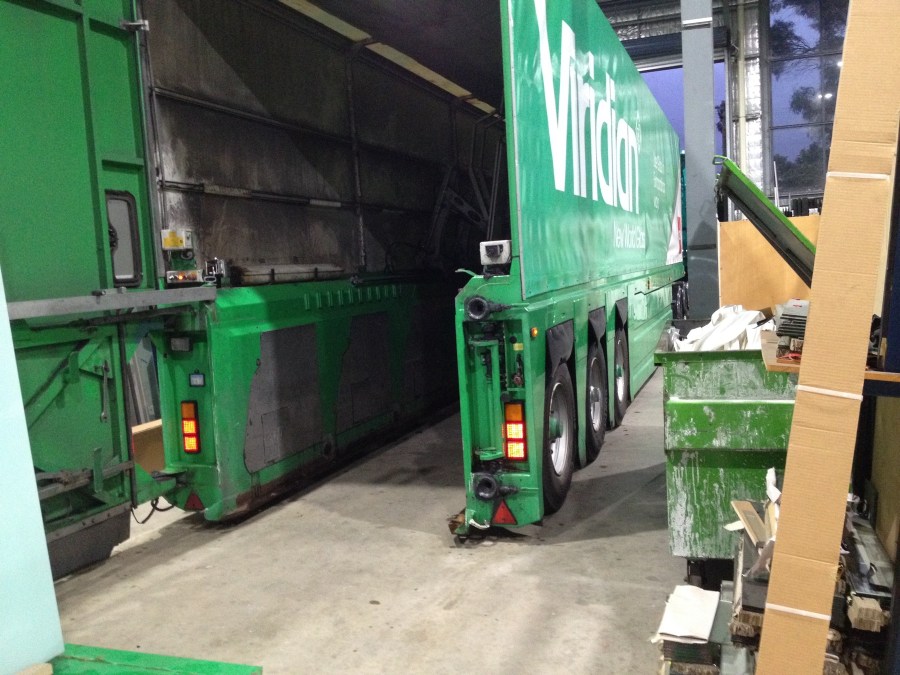 Truck backs up to retrieve dropped deck & empty A frame