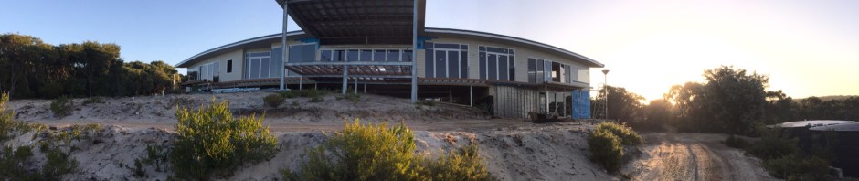 Brad arrived from Mandurah on Thursday with most of the remaining glass to be fitted. He also had onboard the front door that he made to our Specs. and the bottom rail for the decking balustrade, some of which which he had to get curved…… of course.